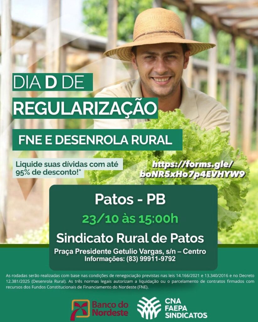 Nesta terça-feira, dia 04 de novembro, Wescley Barbosa, presidente do Sindicato Rural de Patos, entrou em contato com a imprensa para comunicar que nesta sexta-feira (7), a partir das 15h00, vai ser realizado o Dia D de regularização de dívidas com o Banco do Nordeste.