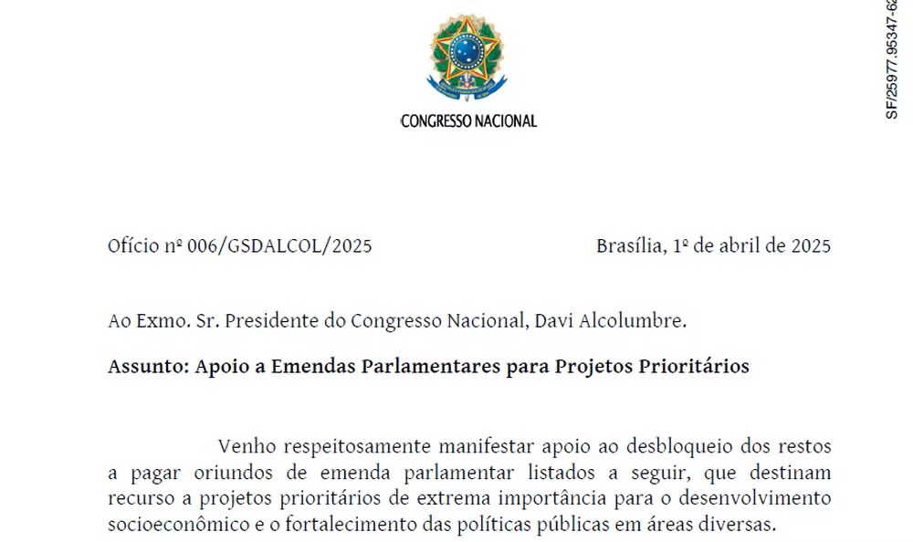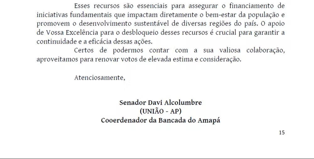 Ao pedir o desbloqueio dos R$ 379 milhões em emendas que não haviam sido pagas, Alcolumbre atribuiu os pleitos à bancada do Amapá no Congresso, pois era coordenador do grupo no momento em que o dinheiro foi indicado. “O endereçamento decorre justamente da função institucional exercida à época. O modelo do ofício de apoiamento é gerado automaticamente pelo sistema, conforme padrão estabelecido e dirigido ao presidente do Congresso Nacional”, diz, em nota.