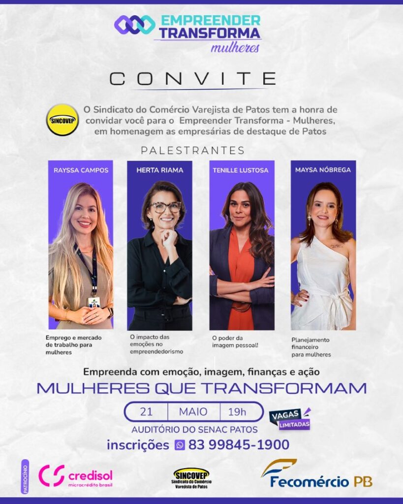 Com vagas limitadas, a palestra é uma iniciativa do Sindicato do Comércio Varejista de Patos (SINCOVEP) em parceria com a terapeuta Herta Riama e conta com o apoio da Federação do Comércio de Bens, Serviços e Turismo do Estado da Paraíba (Fecomércio PB), além de entidades parceiras.