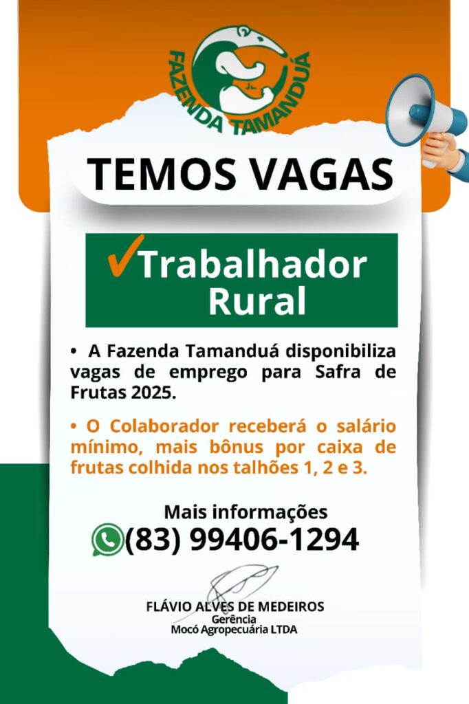 Diante da colheita, a Fazenda Tamanduá vai contratar 50 trabalhadores do sexo masculino e feminino para ampliar o número de pessoas envolvidas no processo da safra.