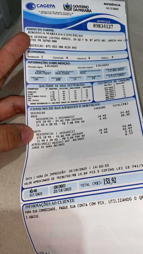 A CAGEPA dispõe de rede de tratamento de esgoto no Conjunto São Judas Tadeu I e II e com isso o valor da água é acrescido em até 80% sobre o valor do consumo pago. No detalhamento, Jerssyca consumiu mais de 10 metros cúbicos e a conta veio R$ 73,00 acrescido de R$ 67,27 de esgoto, somando o total de R$ 153,92.