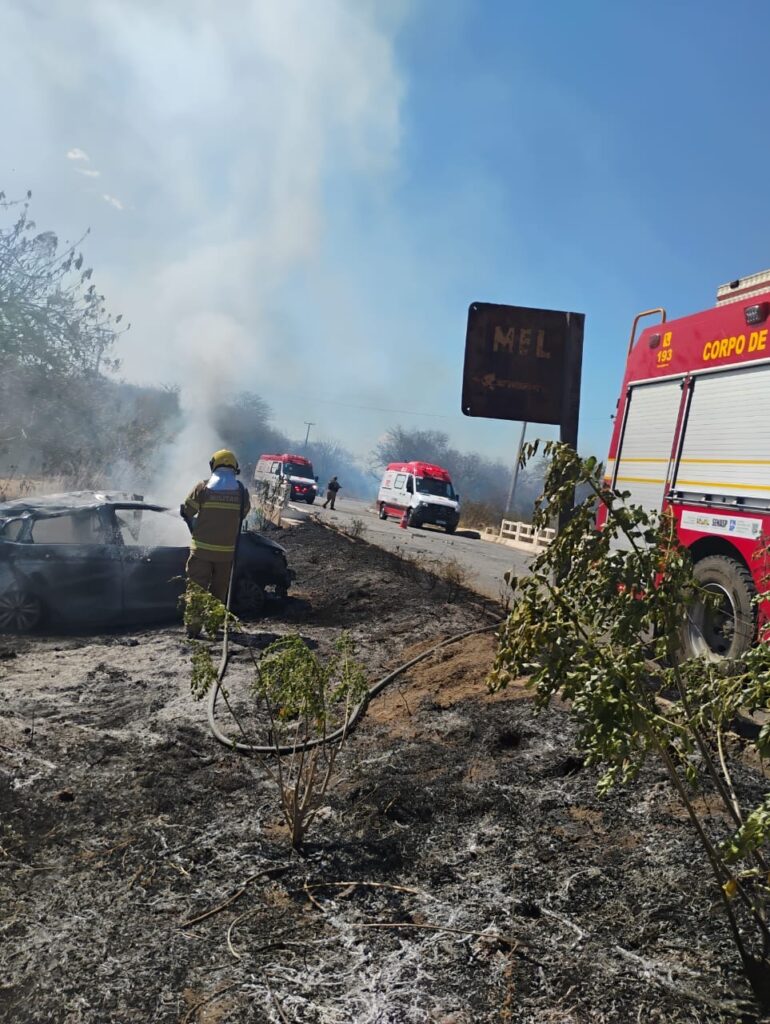 O Corpo de Bombeiros foi acionado porque o carro chegou a pegar fogo após o capotamento. A área foi isolada até a chegada das autoridades para os procedimentos de remoção do corpo e perícia no local.