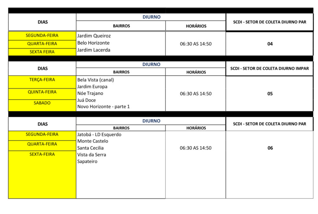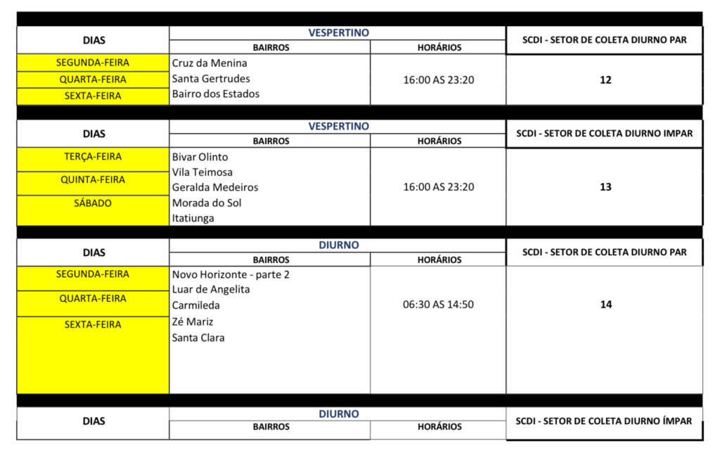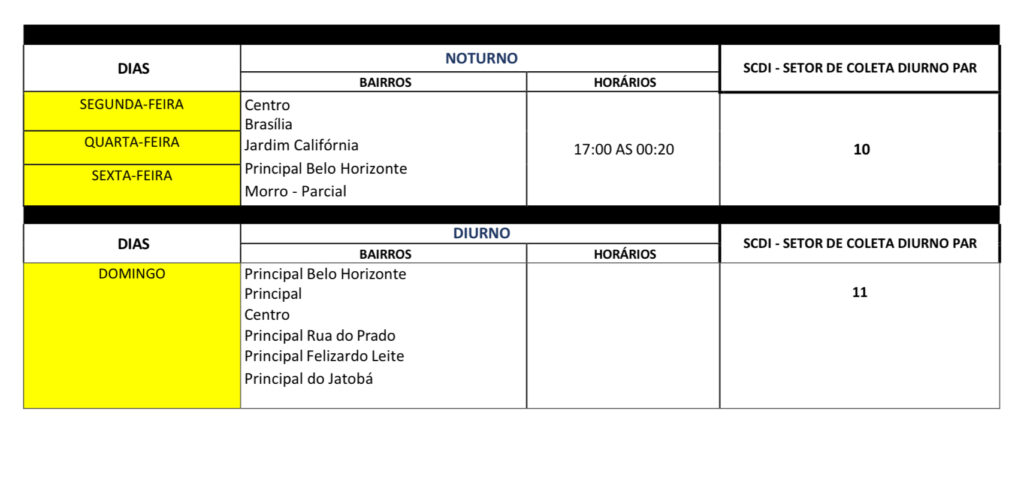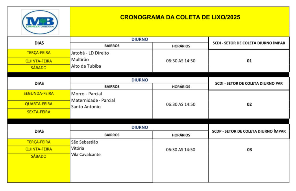 O novo esquema mantém a divisão por setores e turnos – diurno, vespertino e noturno – mas reorganiza os dias de coleta para bairros como Jatobá, Santo Antônio, São Sebastião, Jardim Queiroz, Bela Vista, Novo Horizonte, Centro e Brasília, entre outros, distribuídos entre dias pares e ímpares.