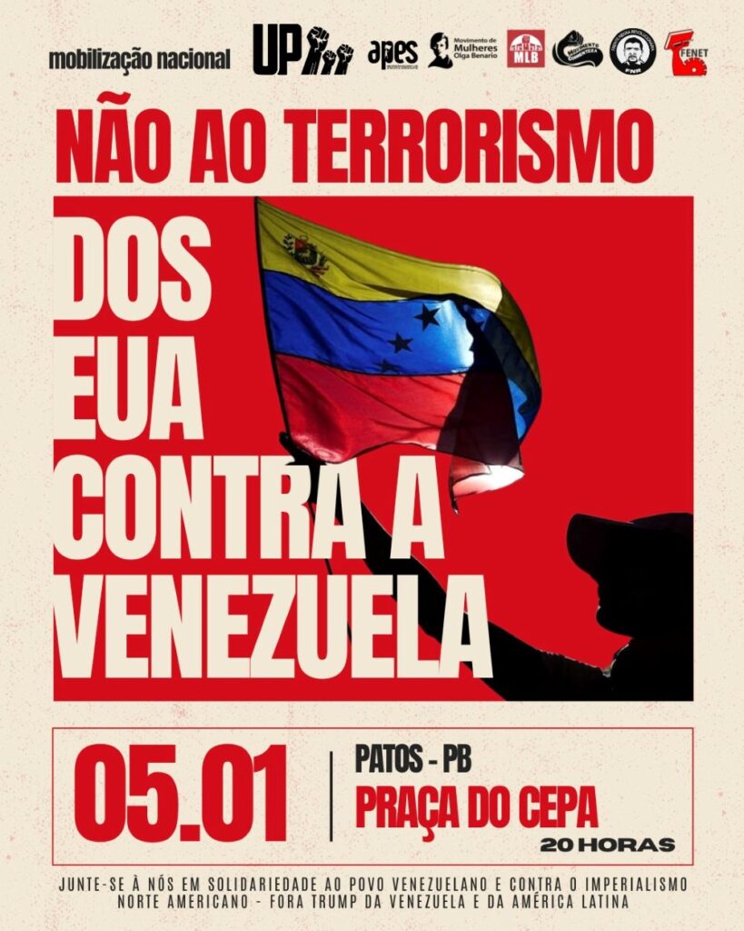 Nesta segunda-feira, dia 5 de janeiro, às 20h00, na Praça do CEPA, centro de Patos, um ato está sendo convocado para repudiar a invasão no território venezuelano e em defesa da soberania na América Latina.