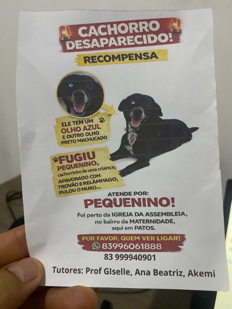 Qualquer informação que ajude a reencontrar o Pequenino pode ser repassada pelos telefones (83) 9 9606 1888 e 9 9994 0901.
