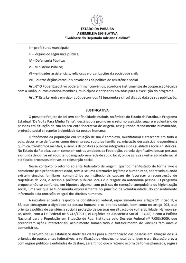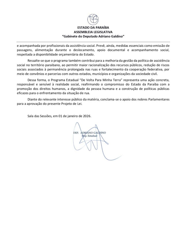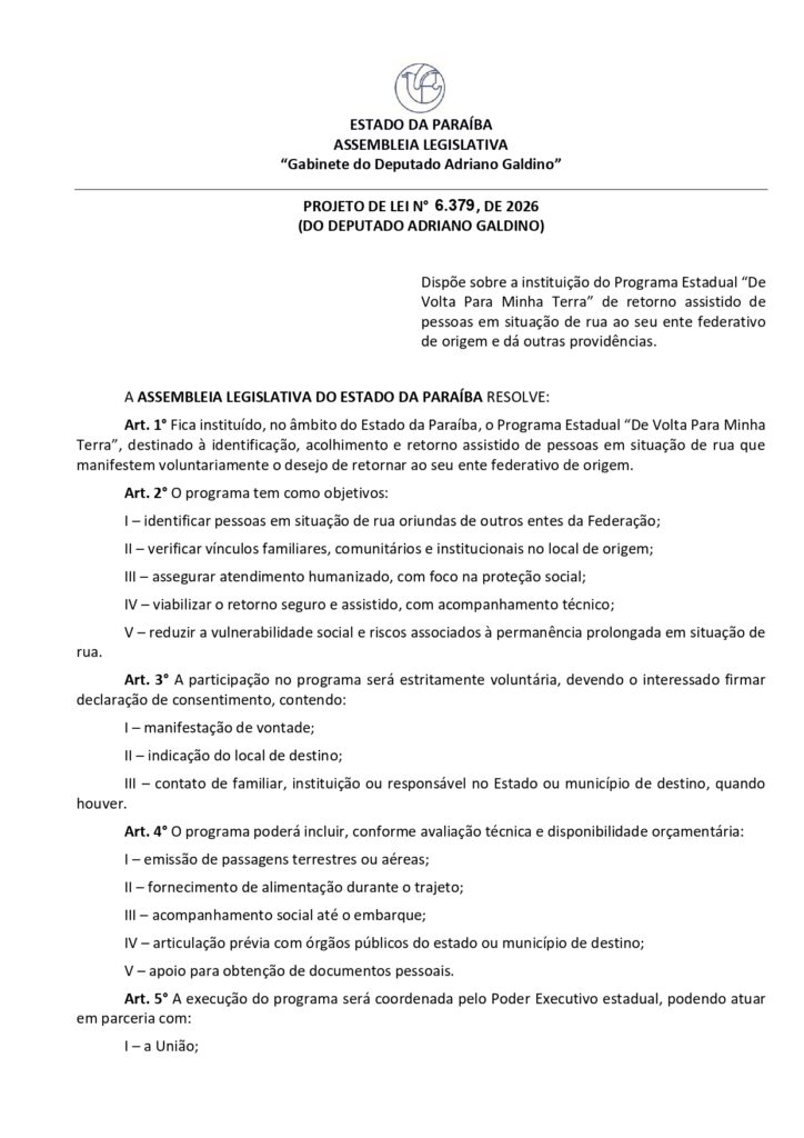 O presidente da Assembleia Legislativa da Paraíba (ALPB), deputado estadual Adriano Galdino (Republicanos), apresentou o Projeto de Lei 6.379/2026, que “dispõe sobre a instituição do Programa Estadual ‘De Volta Para Minha Terra’ de retorno assistido de pessoas em situação de rua ao seu ente federativo de origem e dá outras providências.’ A matéria foi aprovada pela ALPB, na sessão ordinária desta terça-feira (24/02).