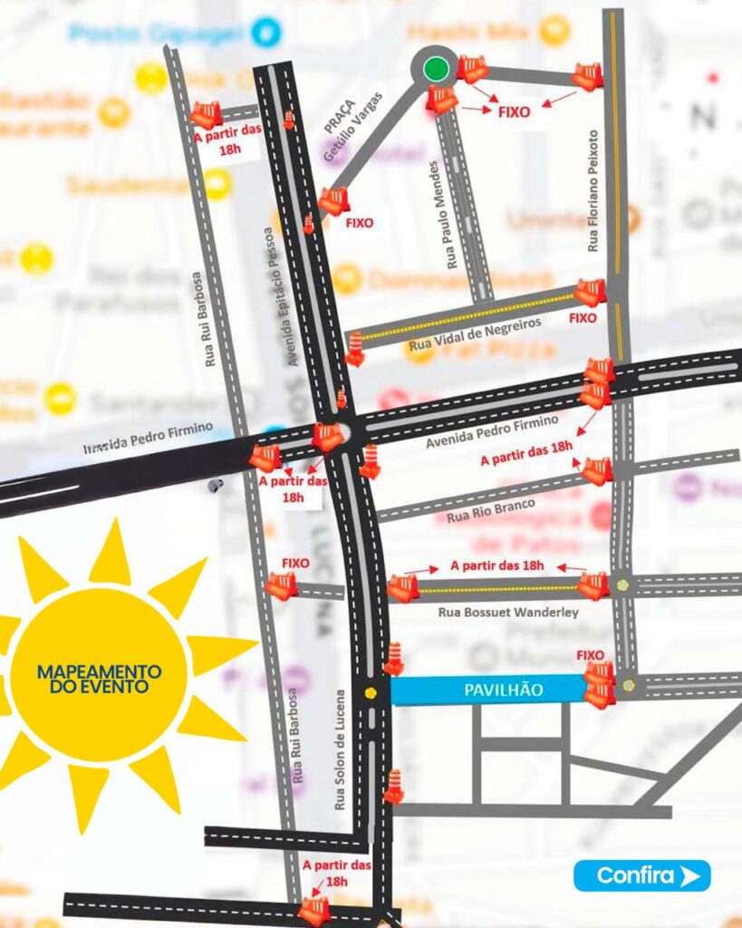 A Superintendência de Trânsito e Transporte de Patos PB – STTrans divulga, nesta quarta-feira, dia 10 de setembro, o mapa das ruas que serão interditadas no período da Festa de Setembro, de 14 a 24, além dos pontos de bloqueios.
