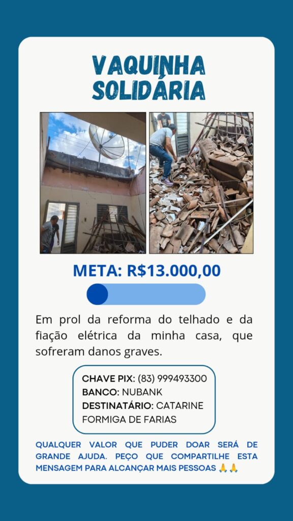 As contribuições da campanha solidária podem ser feitas diretamente no PIX de Catarine que é 83 9949 3300.