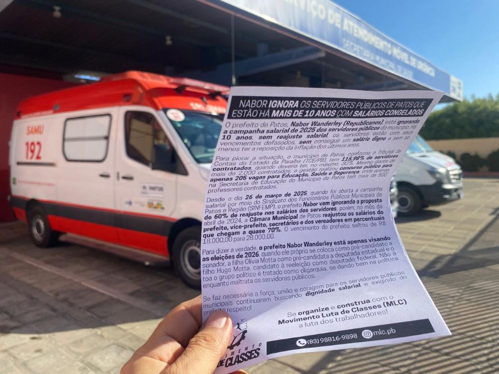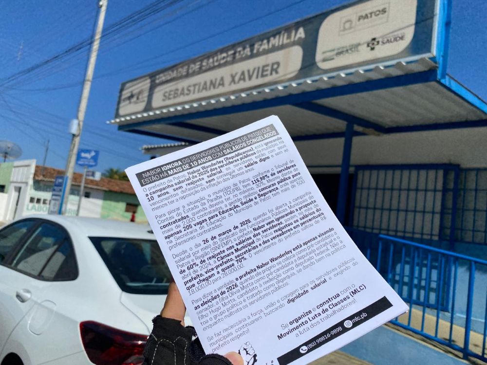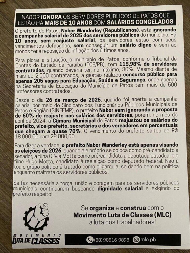 Na manhã desta segunda-feira, dia 20 de outubro, o Movimento Luta de Classes (MLC) entregou centenas de panfletos para denunciar a postura do prefeito de Patos, Nabor Wanderley (Republicanos), que vem ignorando a campanha salarial de 2025 dos servidores públicos do Município.