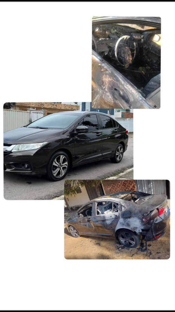 Natália relatou que estava na casa dos seus avós, no Bairro dos Estados, em Patos, quando, na noite do sábado, dia 25 de outubro, por volta da meia-noite, foi surpreendida com o carro do seu esposo em chamas. O automóvel Honda, modelo City, ficou completamente destruído com o provável ato do seu ex-marido que, de acordo com Natália, não aceita o fim do relacionamento. Antes de atear fogo, o ex-marido teria quebrado o vidro traseiro e chutado a porta do carro.